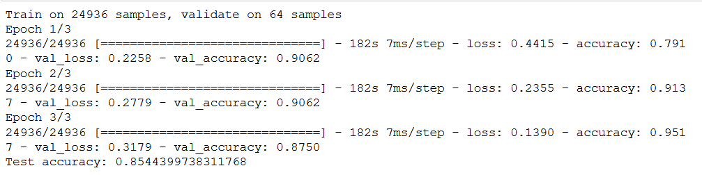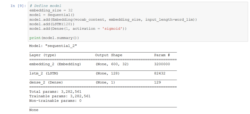 So the first burn went quite smoothly. I used the preloaded Keras IMDB data-set, easily imported into Python. This data-set already has all of the words of the reviews converted to integers that we can directly feed to the machine learning model. All we had to do was pad the reviews to our liking and feed them to our model. Using Keras some more, I created the model and went through a couple runs. Here’s how it looks: