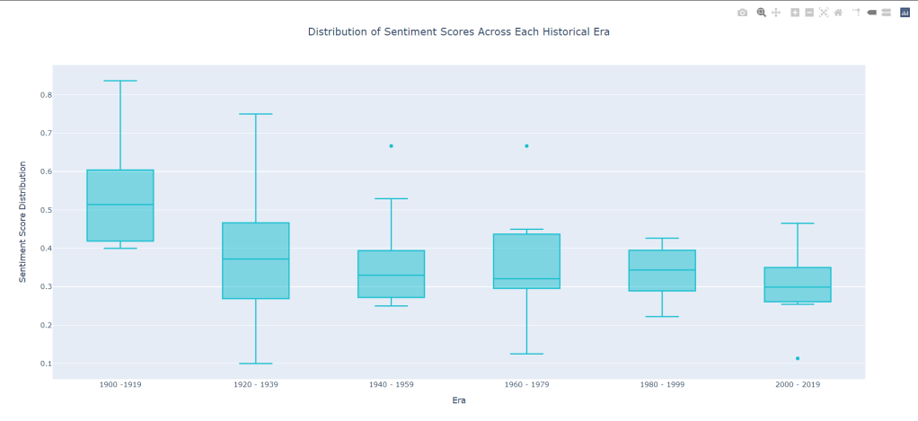 Now for the more meaty bit: The overall average sentiment per era of time. Will there be any consistency? Will it just be another scatter messed? Let’s take a look at this box plot: