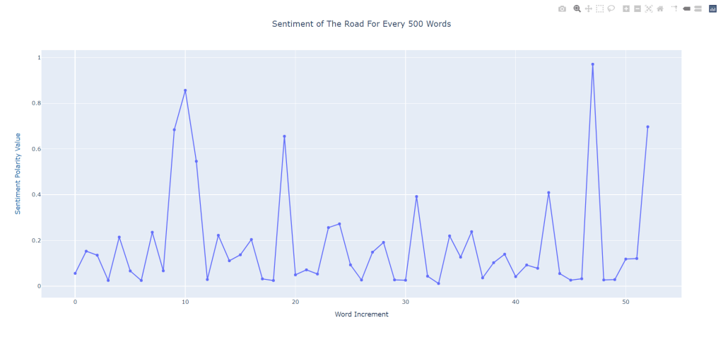 After we output all the data, we make a couple of visualizations. Some interesting results are yielded. Since we are able to get polarities for every 500 words of a book, we can draw up a scatterplot of sentiment development on a page by page basis. Let’s take a look at The Road (2006) by Cormac McCarthy.
