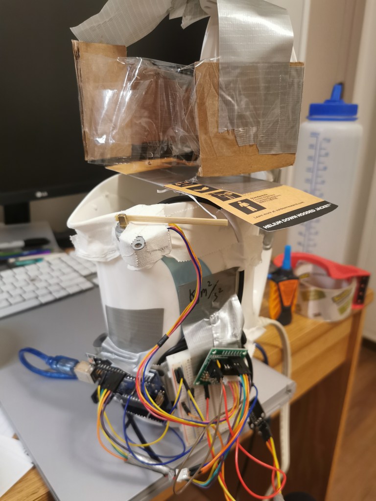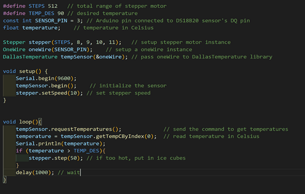 I sought out to build a poor but low cost version of this piece of equipment with an electric water kettle, an arduino, a water temperature sensor, a stepper motor, and some ice. The general logic works as follows: We set a desired temperature we want to heat the water to. The electric kettle heats the water to that temperature. When the water temperature exceeds our desired temperature, the stepper motor pulls back a platform with some ice in it and drops some ice into the water. The water temperature is then below the desired temperature, and the kettle adds heat again. This cycle repeats and the water temperature is maintained. A fairly simple control loop.